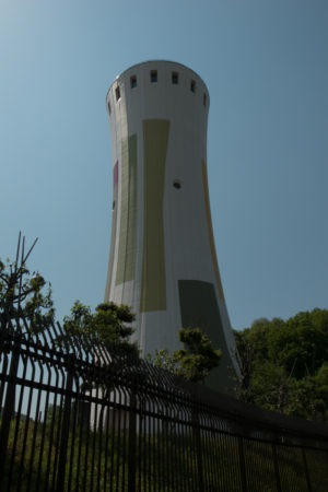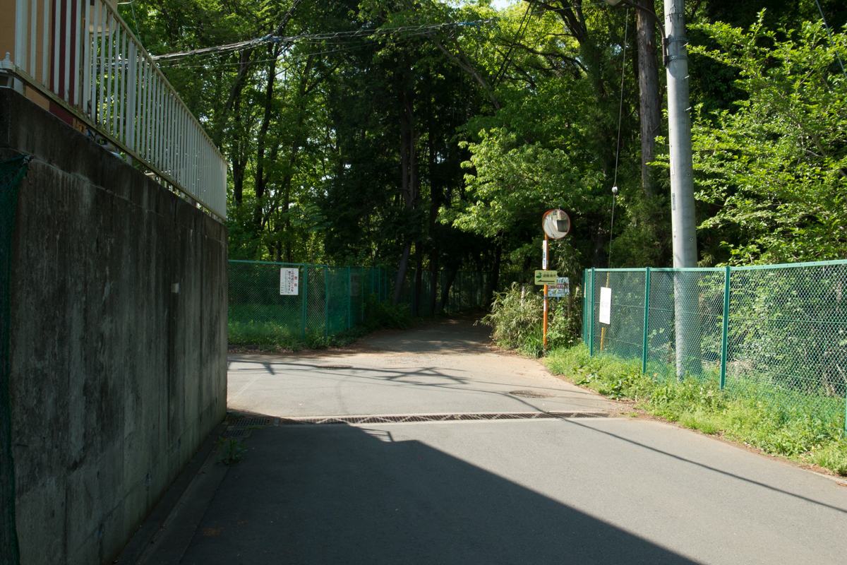 今回間違ったポイント。尾根緑道の終わりは道なりに坂を下る。道路を渡って遊歩道を進むとこの給水塔がある。その少し先の陸橋をくぐる手前で左折する。まちがって直進したら住宅地に出てしまった。