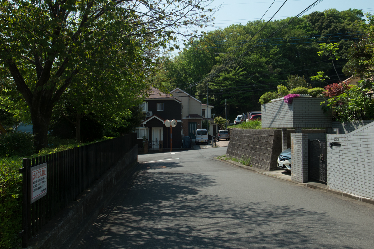 しかし、しばらく行くと行き止まりになって、ロープを伝って降りると日本閣の裏に出る。ネットに書いてあったのはそういうことなのね。昔は尾根伝いに道が続いていたのが、切り通しになって途切れたんだろうな。ここは日本閣に向かって左手に進む。しばらく行った先を右に進むと、少し広い道にぶつかる。道を渡ってラブホテル左の道を直進すると、また未舗装になる。しばらく進むと家をはさんで道が二手に分かれるので、右の道を下っていくと広い道路にぶつかる。そこも道を渡って直進して、道なりに進んでいくと、最終的に片倉近くの川沿いに出る。片倉城址公園を回り込んで左に進むとスーパー銭湯あり。