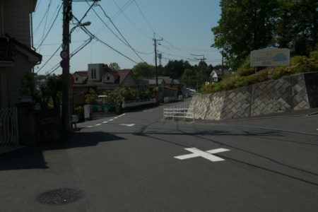 坂を登って道なりに進むとこの五叉路に出る。奥右に進むと16号のバイパスを越える陸橋。